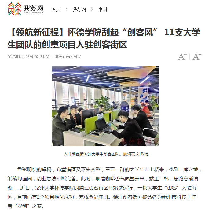 色彩明快的桌椅,布置错落又不失齐整,三五一群的大学生走上楼来,找到一席之地,纸笔勾画间,创业想法不断完善。此时,现磨咖啡香气氤氲开来,端上一杯,思路愈渐清晰……近日,新葡的京集团350vip8888的骥江创客街区开始试运行,一批大学生“创客”入驻街区,目前已有2个项目孵化成功,完成登记注册。骥江创客街区被命名为泰州市科技工作者“双创”之家。