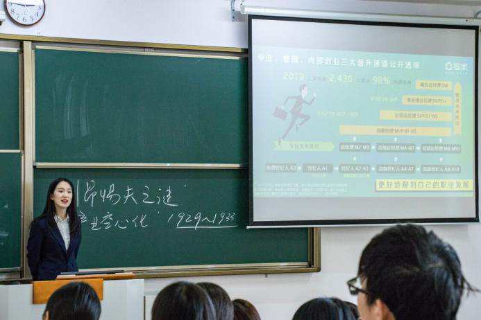 招聘会上,集团代表人从“链家的历史背景”“链家的企业分布”“链家的成长史”入手,着重介绍了企业员工的职业定位、招聘岗位、岗位薪金和福利待遇等大家关注的方面。宣讲结束后,集团代表人进行了有关链家的“有奖竞猜”环节,并为积极回答问题的同学们送上小礼品。