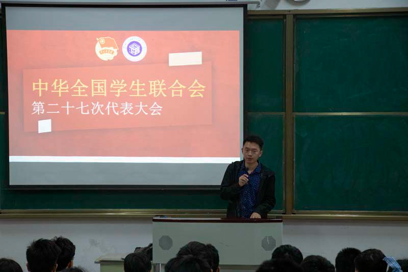 周翔通过PPT展示的方式向大家展示了全国学联二十七大会的主要内容,深入学习了习近平总书记贺信与党中央致词精神。同时,他勉励同学们认真履行青年大学生的职责,做一个作风优良的青年大学生。