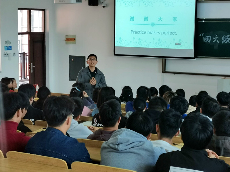 17级叶钦臣、19级顾静娴两位同学从听力、写作、阅读和翻译四个方面结合自己的学习经验,详细讲述了四六级答题技巧以及对于学习发展的建议。会上陈星宇老师指出,有效率的学习需要合理分配时间,提高分数也需要把握技巧。
