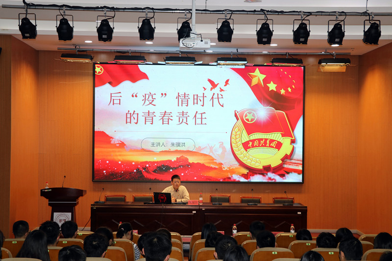 大会在雄壮的国歌声中拉开序幕,系学生会主席黄楠带领全体成员宣读誓词,各位老师为学员代表佩戴团徽并合影留念。随后朱骥洪为全体成员讲述开班第一课——后“疫”时代的青春责任。