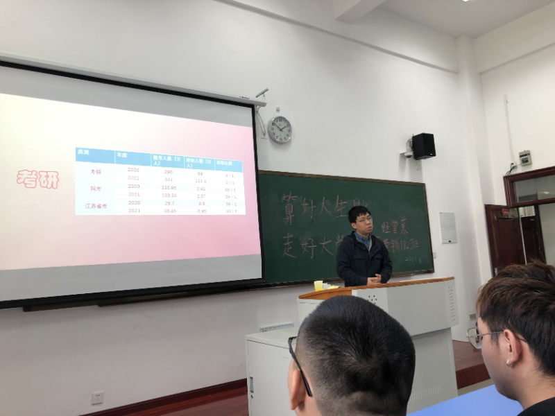 会上,各班班主任围绕“算好人生账,走好大学路”的主题,向大家讲解了关于未来人生道路具体规划及实施计划,并介绍了有关未来规划的基本要求。唐杰与任潇茜老师从考研的角度,提出了严于律己,追求卓越的观点;沈滔老师特别提出大学生应学会自我定位,自我分析,把握现在;王群峰更多从生活方面提出应当珍惜大学美好生活。同学们都认真听讲,部分同学还分享了自己对未来的规划。活动结束,各班班主任都对班会作出了总结并为同学们送上寄语。