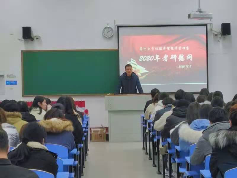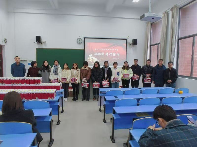 刘茂灿首先通过列举《西游记》中西天取经师徒四人身上的优点,告诉同学们考研需要有持之以恒的毅力,接着又列举了一些有趣的故事来缓解同学们的紧张情绪。最后,刘茂灿祝愿同学们考研顺利,考研学生代表领取考研慰问礼品,并和老师们拍照留念。