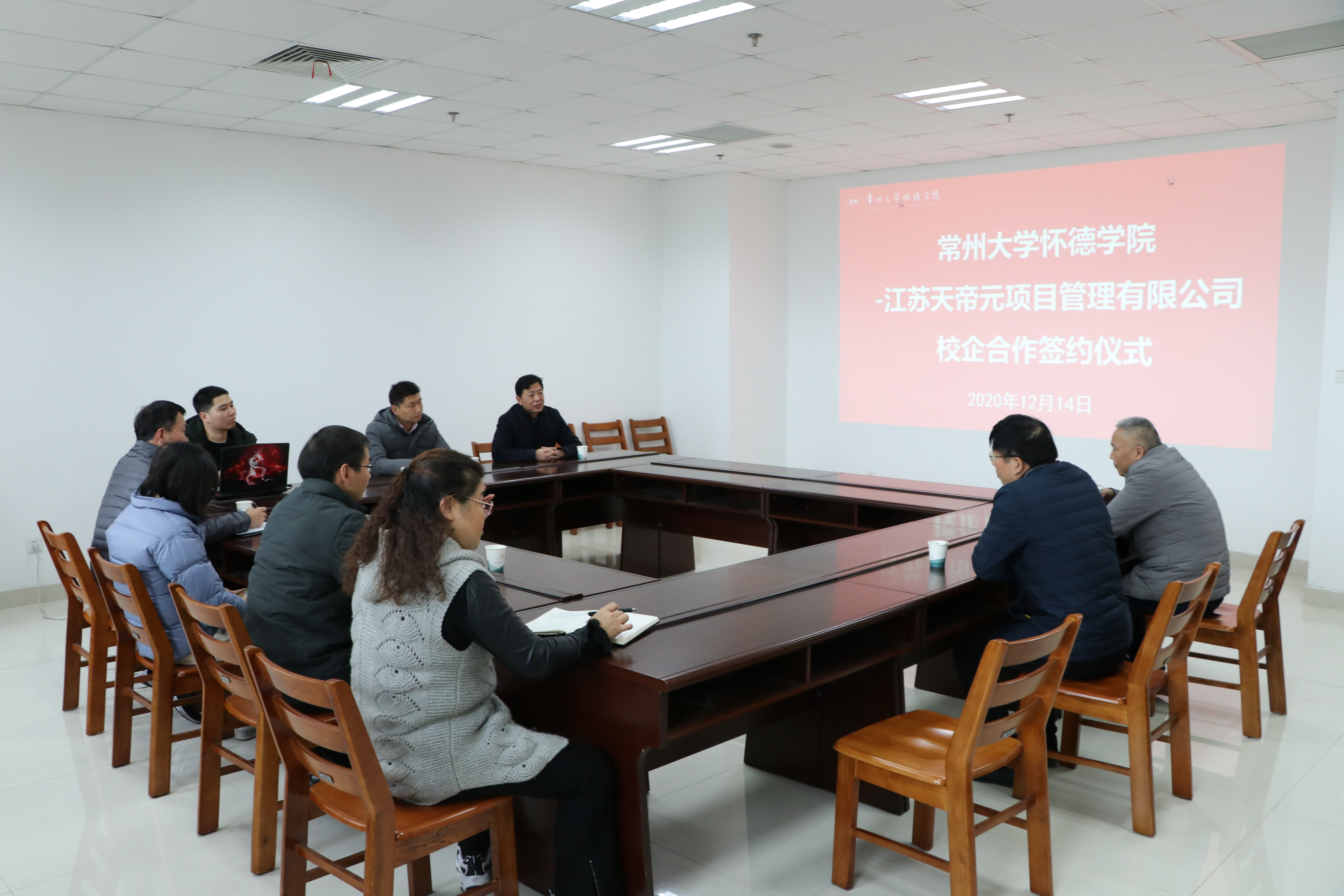 总经理李天晖简要介绍江苏天帝元项目管理有限公司发展情况、企业的用工需求和开展校企合作的思路,希望进一步深化校地校企合作,建立长效合作机制,实现校地校企合作双赢的局面。