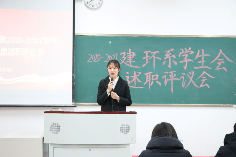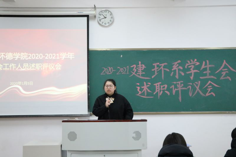 为检验学生干部工作效果,加强青年学生对学生会工作内容的深入了解。建筑与环境工程系于1月5日上午在A103开展学生会述职评议会,由环工202张钰薇主持,学生党支部书记司马亚琴、辅导员张兴刚担任评委,主席团和部长团参加。
