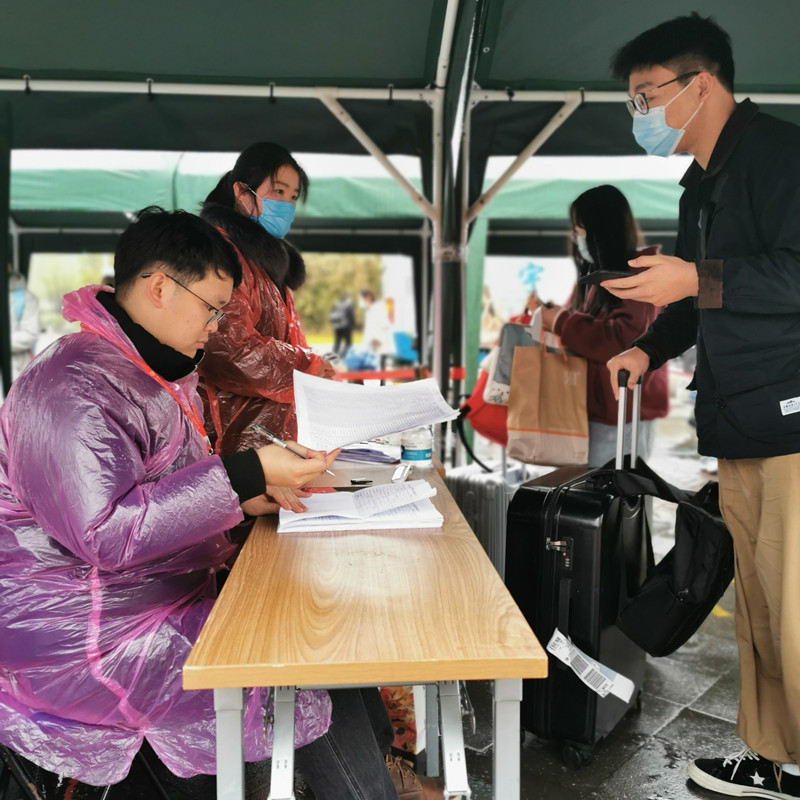 我系辅导员在接到学院新学期学生返校安排后,立刻成立工作小组,严格做好学生相关信息采集、摸排和管理,及时上报返校名单,通知学生提前填写健康登记卡并审核打印,申领健康码、行程卡、核酸检测预约码。报到当天在院北大门迎接返校学生,第一时间为学生提供最贴心的服务,没有一丝一毫的懈怠。逐一为学生提供报到指引、身份验证、体温测量、行李转运等各项服务工作。