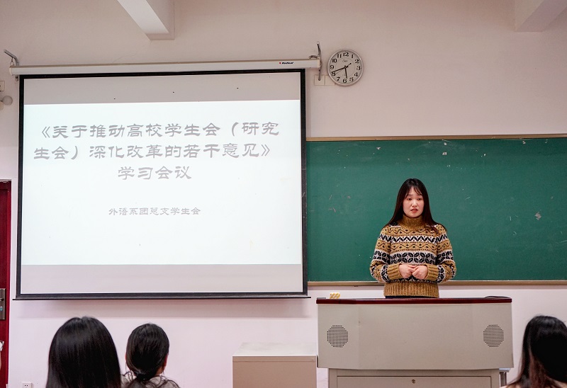 为贯彻引导学生会更好地服务青年学生成长成才,4月20日下午,外语系于A104开展关于推动学生会深化改革专题学习会议。会议由外语系团总支书记刘婧娴主持,学生会主席团及各部门负责人参加。