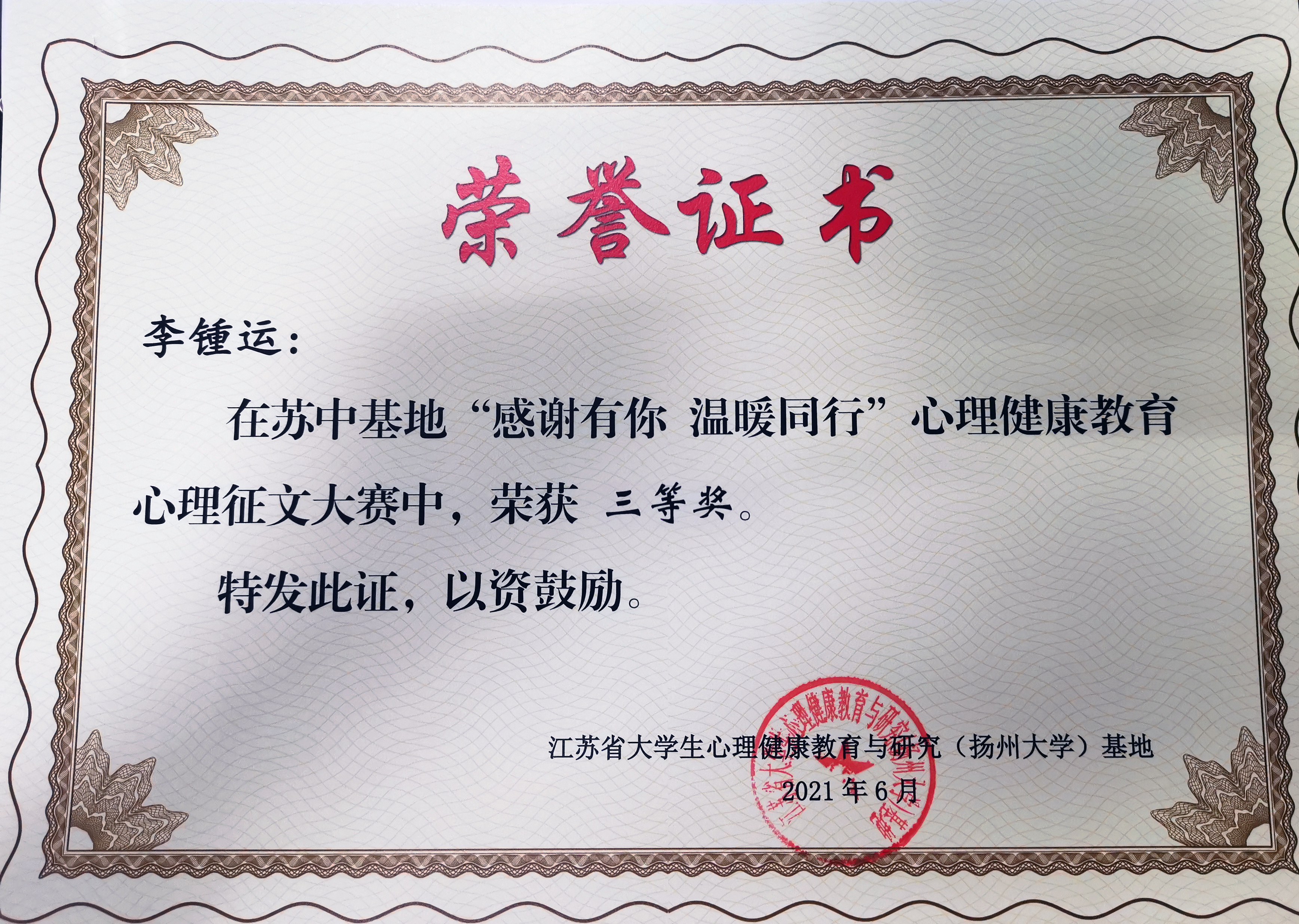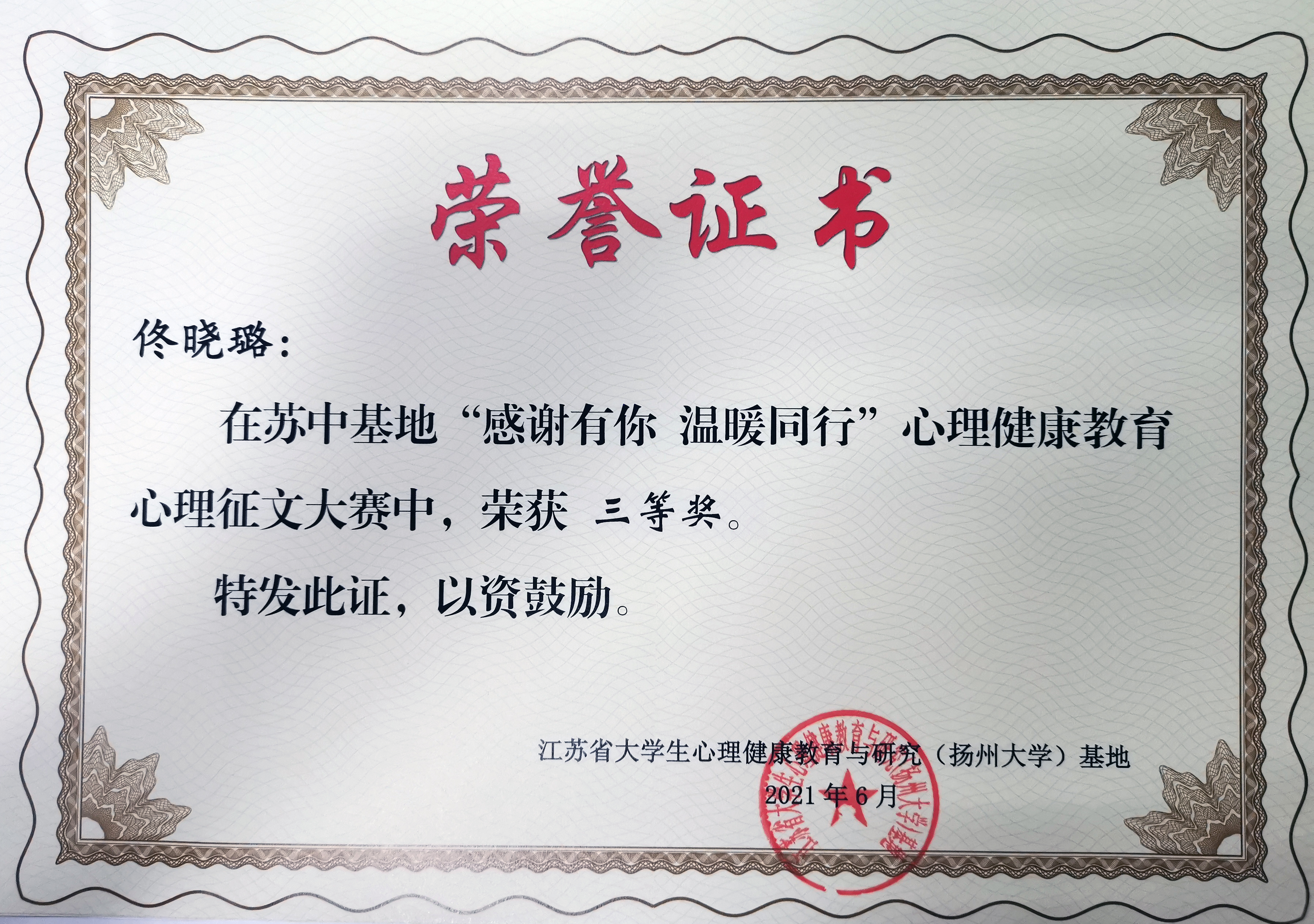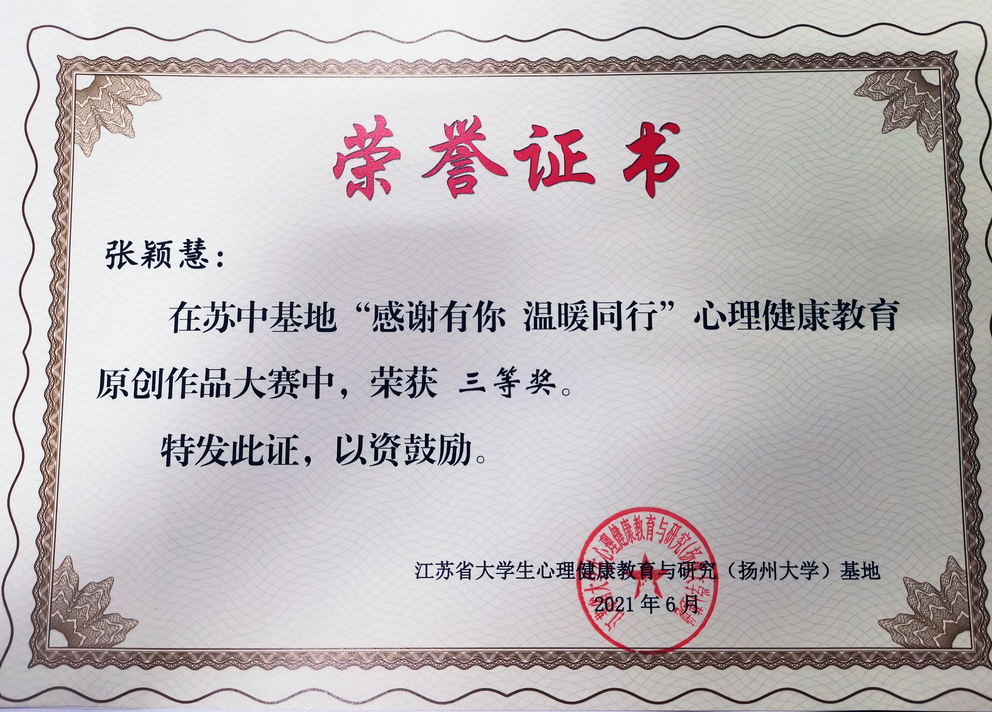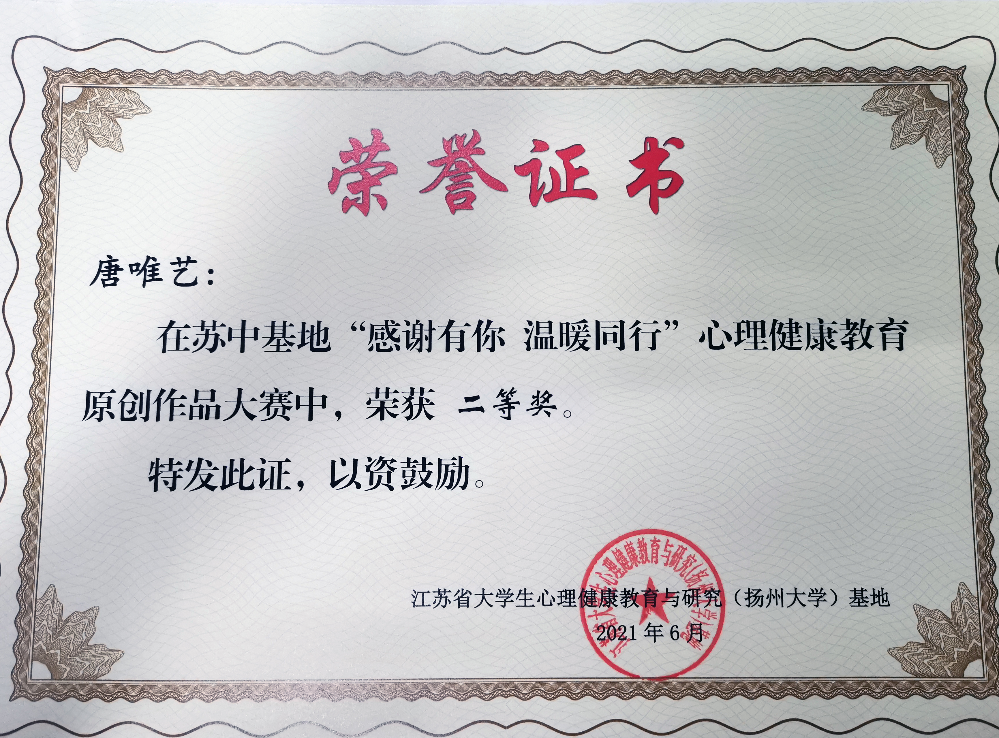 近日,江苏省大学生心理健康教育与研究(扬州大学)基地举办了“感谢有你,温暖同行”心理健康教育原创作品大赛。经评选,新葡的京官网机制204唐唯艺同学荣获二等奖,视觉202李锺运、财务194张颖慧、国贸181佟晓璐同学获得三等奖。