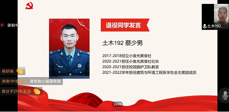 为加强当代大学生党性学习教育,深入宣传伟大的建党精神,9月28日晚,由院团委主办、院学生会承办的“领航·开学第一课”线上直播顺利举行。学生发展部副部长张明军、院团委副书记朱骥洪、建环系20级辅导员张兴刚以及各年级2000余名学生代表参加活动。