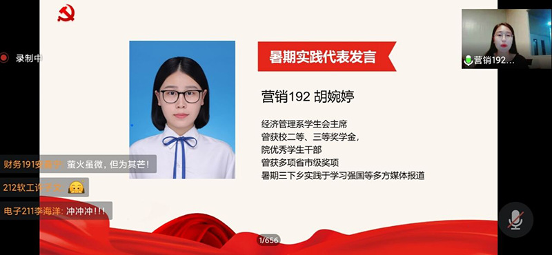 本次活动以“学党史·践实践·振乡村”为主题,通过8名师生代表分享个人心得的形式激发学生奋斗热情。预备党员齐香凝以自身入党经历,表达对党的向往、对党的忠诚,号召当代大学生积极入党,接受党史学习与党性熏陶;退役同学蔡少男以军人的视角重温党的光辉历程、缅怀党的丰功伟绩,呼吁学生勇担责任,牢记使命;抗疫志愿者凌玉洁通过分享自己的抗疫故事,诠释了众志成城的抗疫精神;学生代表王妍分享“党史党性”主题故事,勉励学生把握青春、坚持梦想,为国奉献。活动后半程,以播放全院暑期实践团介绍视频呼吁学生积极投入社会实践活动,丰富自身经历,提升自身素质;其中暑期实践团队代表粱禧龙、胡婉婷分别通过分享自己的亲身体会,激发当代大学生投身“到祖国需要的地方去”的热情;实践团指导老师代表张明军讲述了学校“萤火支教团”的支教故事,鼓励学生勤于实践、砥砺前行;张兴刚提出了对“橼·梦”公益支教团建设和发展的总结和展望,引导广大青年培养自身的社会责任感;最后,朱骥洪鼓励21级新生在大学里不断探索、提升自己并且积极竞选学生组织进而服务同学,同时希望高年级学生在未来找到人生方向,一帆风顺。