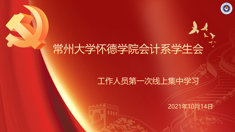 为深入学习贯彻习近平总书记“七一”重要讲话精神,进一步落实《学联学生会组织有关工作提示》中的工作要求,10月14日,会计系顺利召开了学生会工作人员第一次线上集中学习会议。本次会议由团委宣传部副部长张诗捷主持,会计系团总支书记纪有福老师和全体学生会成员参加。