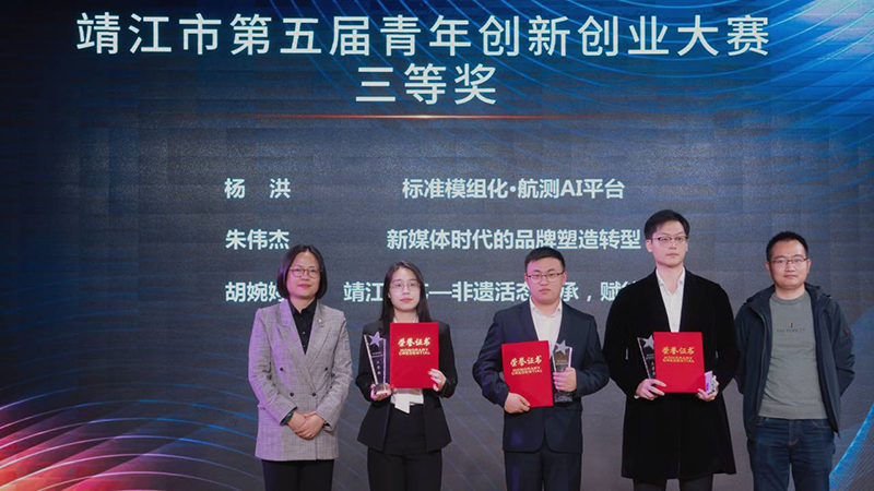 通过现场路演展、评委提问等环节的角逐,《标准模组化航测AI平台》(团队成员:杨洪、郭子睿、秦凯峰、陆志天、张玥)《靖江木艺—非遗活态传承,赋能乡村》(团队成员:胡婉婷、李兆森、张广富、李民国、艾泽清、黄一丹)荣获三等奖,《互联网+源瑾非遗数字博物馆》(团队成员:陈军硕 钟建英 吴佳栋 卿斌 路露 )荣获优秀奖。