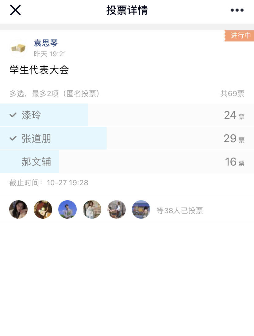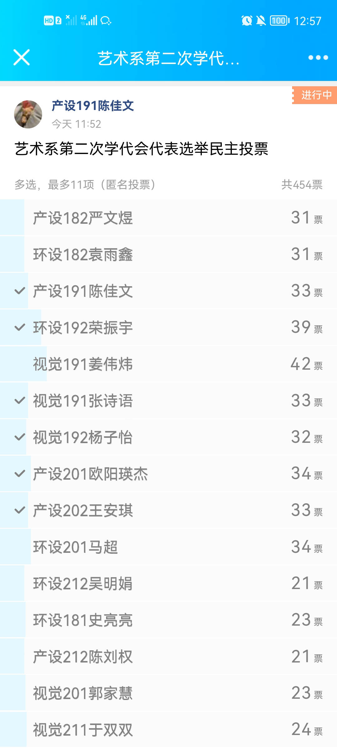 根据《高校学生代表大会工作规则》的有关规定,结合我系实际情况,拟定本次大会的代表为11名,正式代表的产生以班级为基层选举单位,采取自下而上推荐,上下结合、反复酝酿,产生代表候选人,通过学生代表会议民主协商,按照不低于20%差额选举,产生正式代表。27日晚,各班通过线上选举产生班级代表,29日通过班级代表组成系部代表对候选人进行民主投票。本次选举公开、公平、公正,最后通过系部代表的民主投票,选出了包括陈佳文在内的11名正式代表,这11名正式代表将代表艺术系参加学院的学代会。