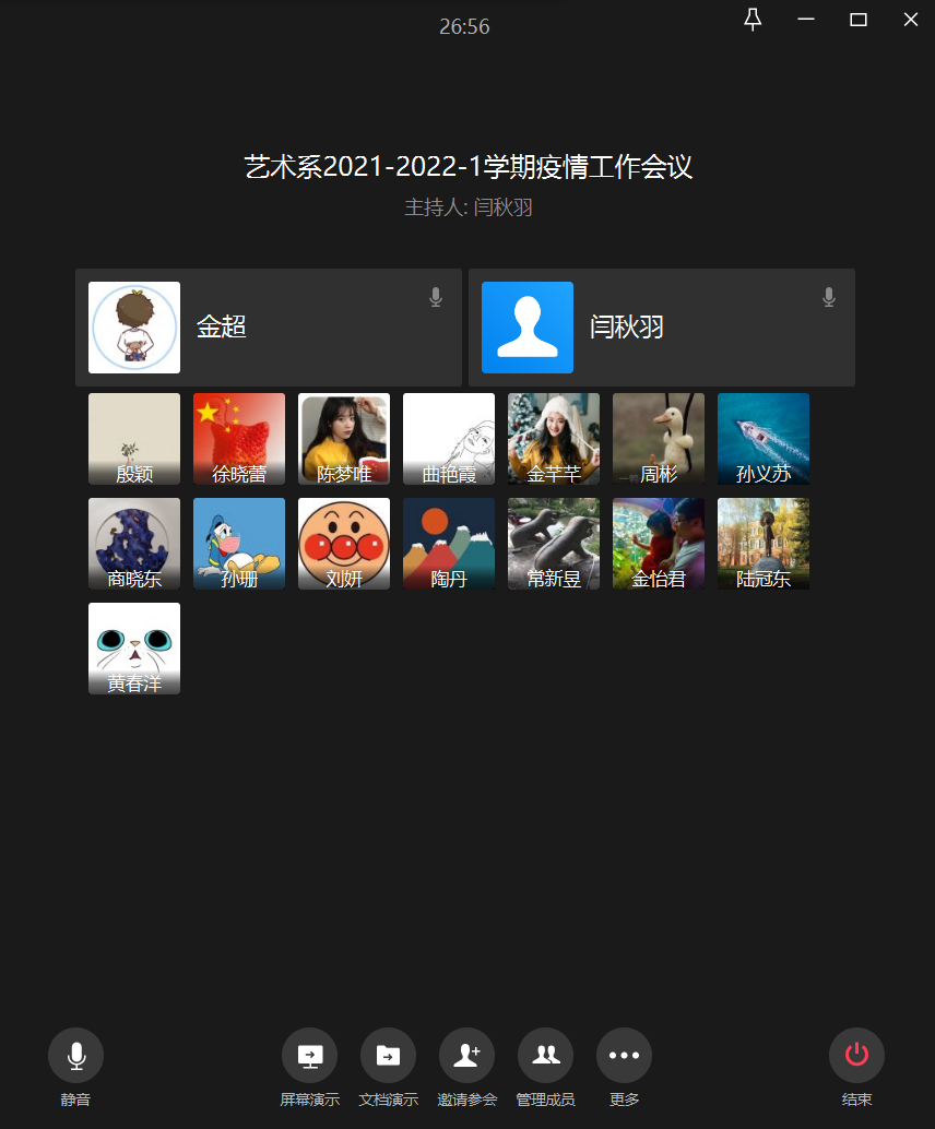 11月4日晚,我系召开线上2021-2022-1学期疫情防控电话工作会议,传达学校疫情防控会议精神,研究近期疫情防控相关工作,并对下一阶段工作重点进行部署。会议由系主任闫秋羽、副主任金超主持,系全体教职工参加会议。