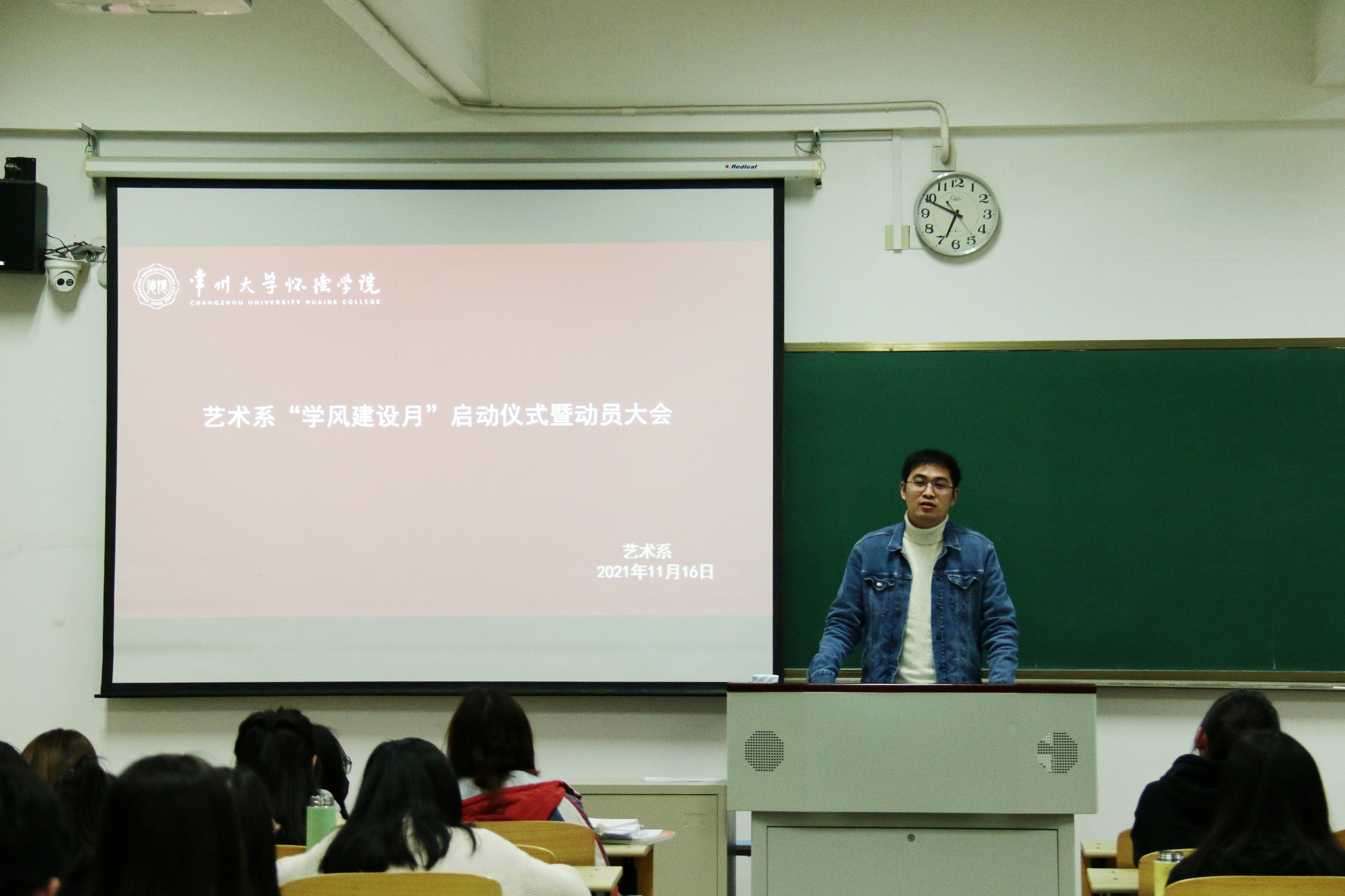 为响应学院“学风建设月”系列活动,提升学生学习的积极性和主动性,激发学生自主学习的兴趣,艺术系于11月16日晚在A401教室开展“学风建设月”启动仪式暨动员大会活动。本次活动由艺术系新生辅导员周彬主讲,艺术系学生代表参与。