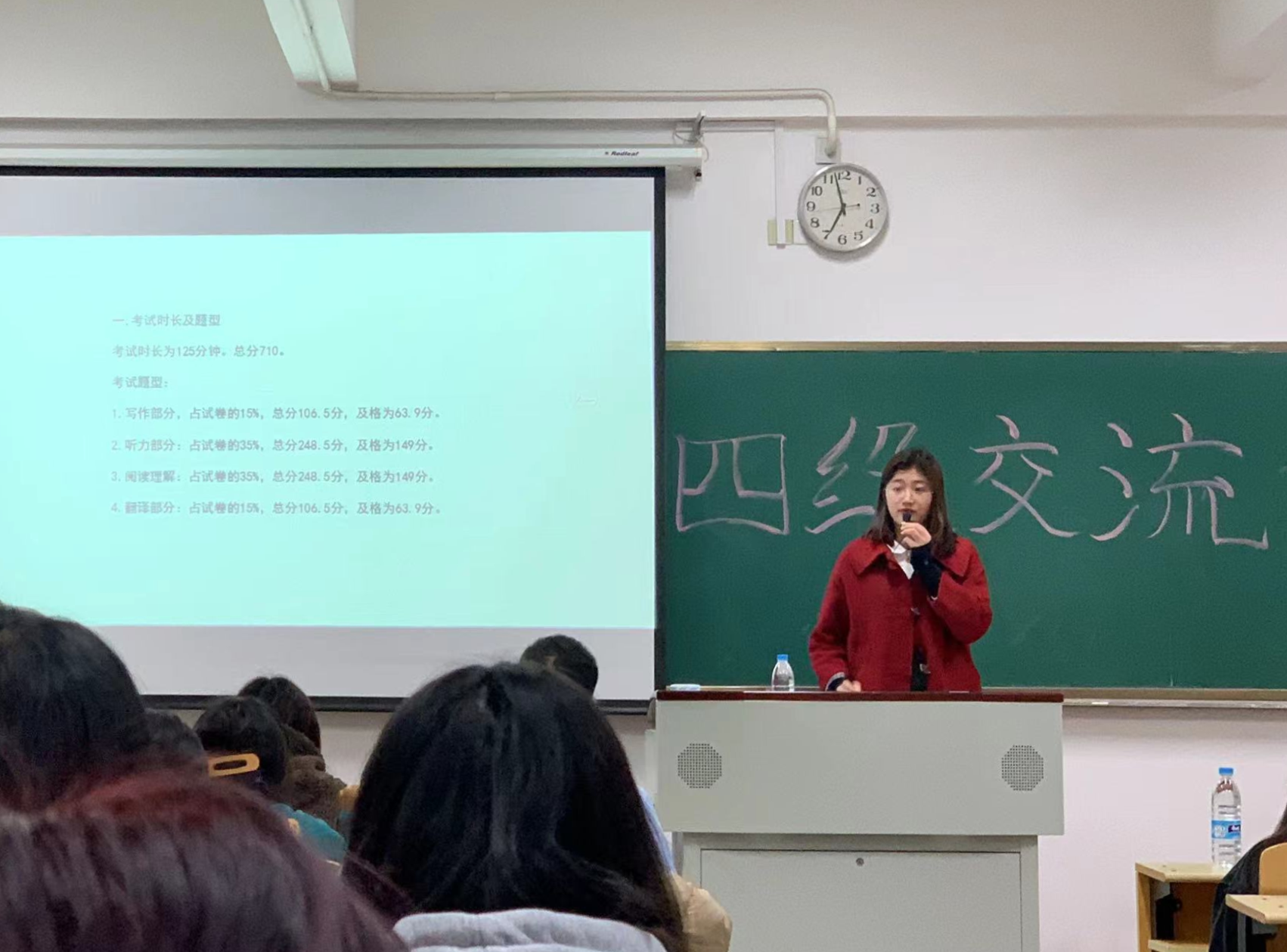 冯老师首先通过对英语四级的简化解读,使同学们对英语四级的题型、分值分布、考试时间等具体流程有了进一步的了解,冯老师分化了英语四级的难度,考英语四级是一个阶段性的过程,只要把握好这样一个阶段性的过程,通过英语四级考试便指日可待。随后,冯老师特别邀请了三位高分通过英语四级的高年级同学分别从不同方面讲述了他们备战四级的经验。她们在分享过程中提到的端正态度,寻找规律以及联想记忆的重要性对于大一新生而言十分受用。在交流过程中,大一新生有诸多不懂的问题,冯老师和高年级的学姐们也鼓励他们勇敢说出来并为他们一一答疑解惑。最后,冯老师对此次交流会进行了补充和总结。英语四级只是同学们在大学诸多考试中的一个,它并不是你成功路上的绊脚石,相反的,它能为你以后的就业增添一定的砝码,过英语四级不一定代表你的英语水平有多好,但是不过英语四级便可以看出你对学习的态度有多一般,世上无难事只怕有心人。