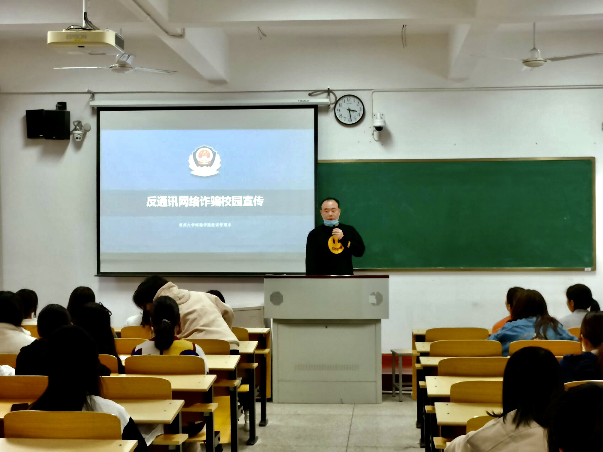 为了让同学们增强自我保护意识,提高对诈骗术的处理能力,防止上当受骗,学会利用法律手段维护自身利益,11月22日,经管系在A教学楼组织开展新生安全防诈骗教育活动,辅导员石绍明老师和朱伯媛老师主讲。