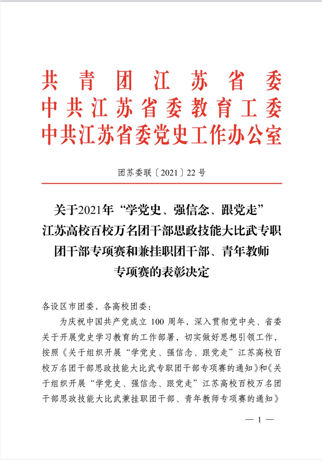 近日,由共青团江苏省委、江苏省委教育工委、江苏省委党史工作办公室主办的“学党史、强信念、跟党走”江苏高校百校万名团干部思政技能大比武结果公布,新葡的京官网教师徐婷获得兼挂职团干部、青年教师专项赛三等奖。