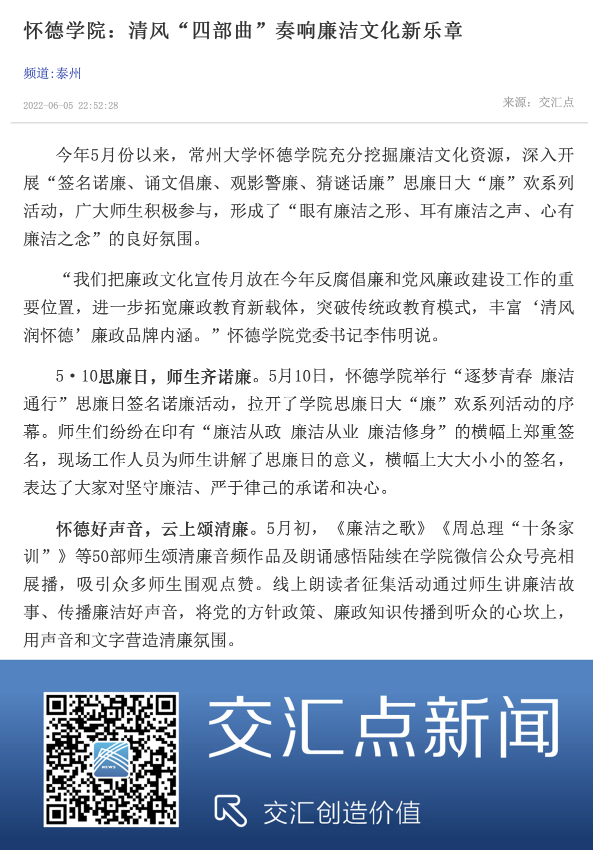 怀德好声音,云上颂清廉。5月初,《廉洁之歌》《周总理“十条家训”》等50部师生颂清廉音频作品及朗诵感悟陆续在学院微信公众号亮相展播,吸引众多师生围观点赞。线上朗读者征集活动通过师生讲廉洁故事、传播廉洁好声音,将党的方针政策、廉政知识传播到听众的心坎上,用声音和文字营造清廉氛围。