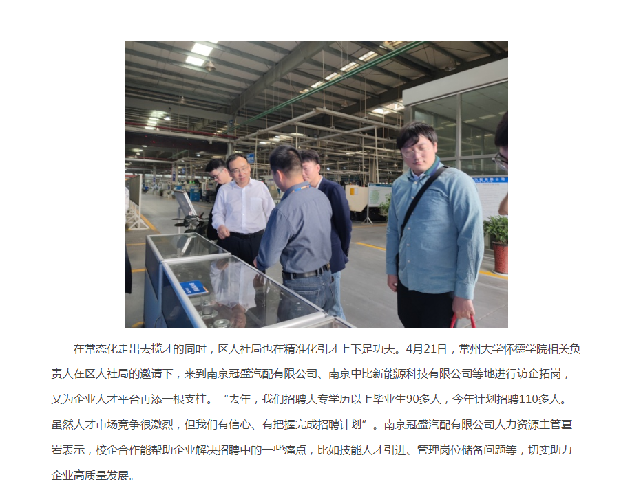 4月21日,新葡的京集团350vip8888相关负责人在区人社局的邀请下,来到南京冠盛汽配有限公司、南京中比新能源科技有限公司等地进行访企拓岗,又为企业人才平台再添一根支柱。“去年,我们招聘大专学历以上毕业生90多人,今年计划招聘110多人。虽然人才市场竞争很激烈,但我们有信心、有把握完成招聘计划”。南京冠盛汽配有限公司人力资源主管夏岩表示,校企合作能帮助企业解决招聘中的一些痛点,比如技能人才引进、管理岗位储备问题等,切实助力企业高质量发展。