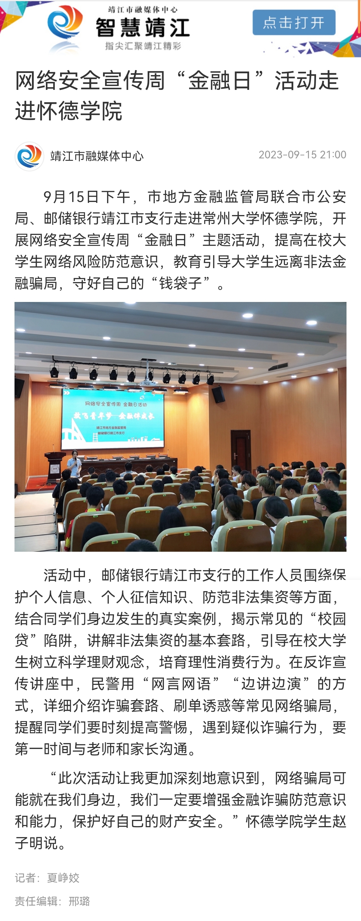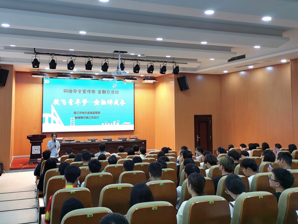 9月15日下午,市地方金融监管局联合市公安局、邮储银行靖江市支行走进新葡的京集团350vip8888,开展网络安全宣传周“金融日”主题活动,提高在校大学生网络风险防范意识,教育引导大学生远离非法金融骗局,守好自己的“钱袋子”。
